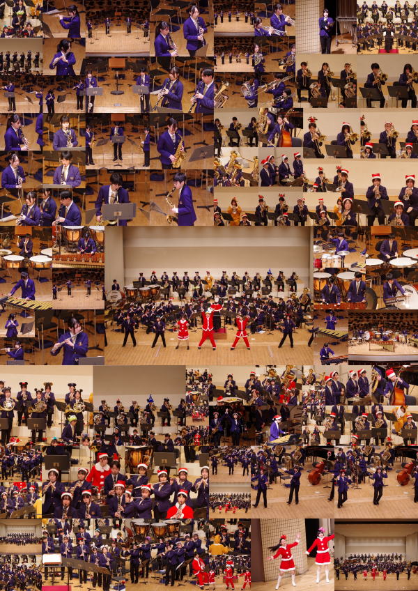 アンサンブルコンテストに出場するメンバーの演奏から始まり、J-POPのメドレーなどの楽曲やパート紹介を行いました。サンタクロースも来場し、プレゼント抽選会も行いました。